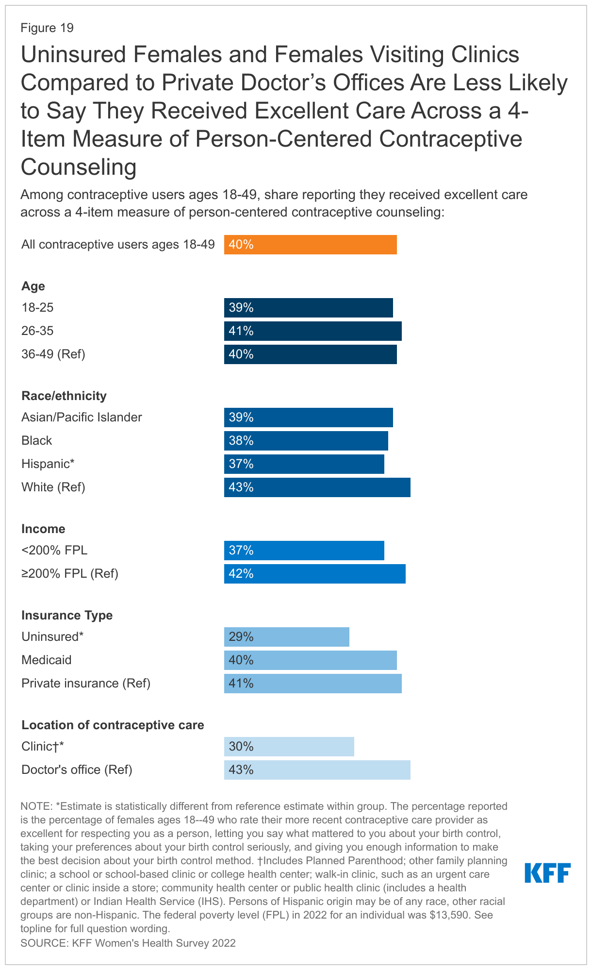 Interactions with providers play an important role in the quality of contraceptive care, as providers are the main source of information that people have when making a decision about their birth control and understand potential side effects. While there has been considerable emphasis on prioritizing access to the most effective methods, there is also growing recognition of the importance of ensuring that patient-provider relationships are patient-centered and support patient decision making in the context of contraceptive counseling. Approximately 40% of female contraceptive users rate their most recent contraceptive care provider as “excellent” on all four items of person-centered contraceptive counseling (Figure 19): respecting them as a person, letting them say what mattered to them about their birth control method, taking their preferences about their birth control seriously, and giving them enough information to make the best decision about their birth control. Uninsured females and females receiving contraceptive counseling at clinics compared to private doctor’s offices are less likely to rate their care as excellent.