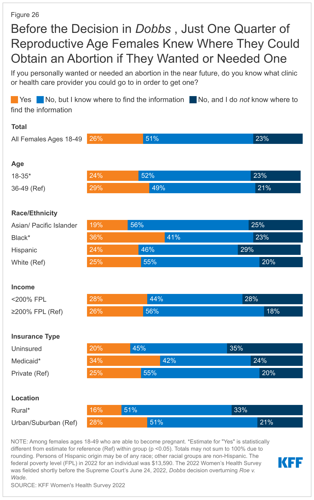 Prior to the ruling in Dobbs, just one-quarter (26%) of females ages 18-49 said they knew what clinic or health care provider they could go to for an abortion if they wanted or needed one. A relatively small share of reproductive age females knew where they could obtain abortion if they needed one, and while half (51%) said they did not know a specific place where they could get an abortion but knew where they could get the information, that has likely become more difficult since the Dobbs ruling. Abortion is now outlawed in many states and in some states, there is ongoing litigation. Ongoing court rules have created a confusing and shifting patchwork of policies in many states across the country. Just prior to the Dobbs decision, nearly one in four (23%) females did not know where they could go and did not know where to find that information (Figure 26).