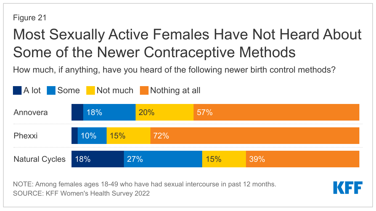 Most sexually active, reproductive age females are not familiar with contraceptive methods that have recently come to the market. In recent years, the FDA has approved some new contraceptive options, some of which are designed to have fewer side effects. However, awareness of these newer methods is low. Just over one in five (22%) sexually active females has heard some or a lot about Annovera, a vaginal ring that is effective for up to one year approved by the FDA in 2018 (Figure 21). Phexxi is a novel contraceptive vaginal gel that received FDA approval in 2020, but just over one in ten (13%) females has ever heard anything about it. A higher share of females (45%) has heard a lot or some about Natural Cycles, an app that can be used to track the menstrual cycle and identify fertile periods and was cleared by the FDA as a medical device in 2018. A higher share of younger females ages 18-35 than those ages 36-49 report having heard at least something about Annovera (24%, 20% respectively) and the Natural Cycles app (51%, 38% respectively) (data not shown).