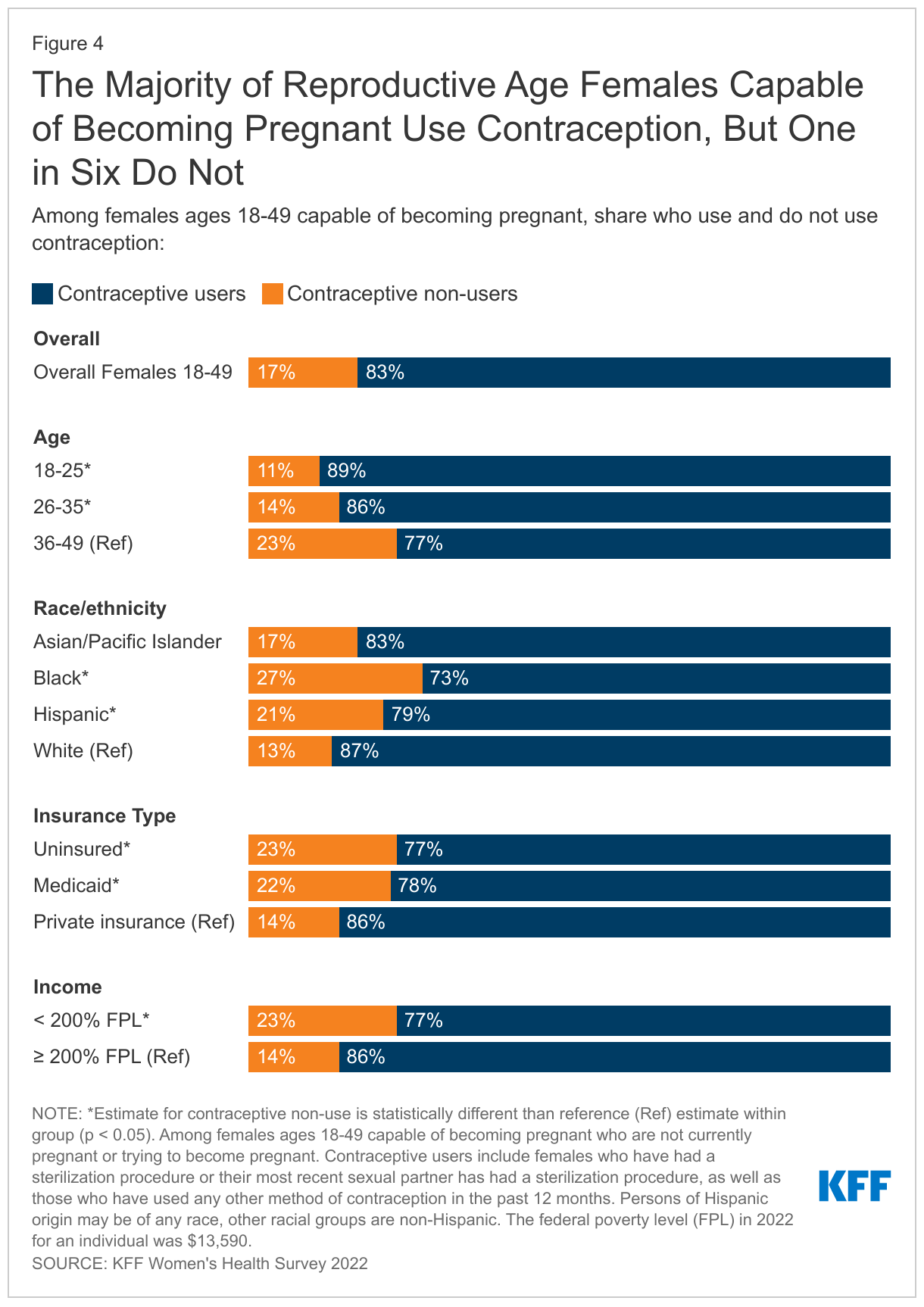 More than eight in ten sexually active females who are not currently pregnant and capable of becoming pregnant use contraception, but one in six do not. The majority (83%) of sexually active reproductive age females who are able to conceive, not currently pregnant nor trying to become pregnant report using at least one method of contraception in the past 12 months (Figure 4). However, one in six (17%) report that they do not use contraception and are not trying to conceive. More than a quarter (27%) of Black females in this group report that they are not using contraception compared to one in five (21%) Hispanic females, 17% of Asian/Pacific Islander females, and 13% of White females. Nearly one in four (23%) uninsured females and those with Medicaid coverage (22%) report not using contraception compared to 14% of females with private insurance (employer-sponsored and individual). Similarly, 23% of females with low incomes report not using contraception compared to 14% of individuals with higher incomes.