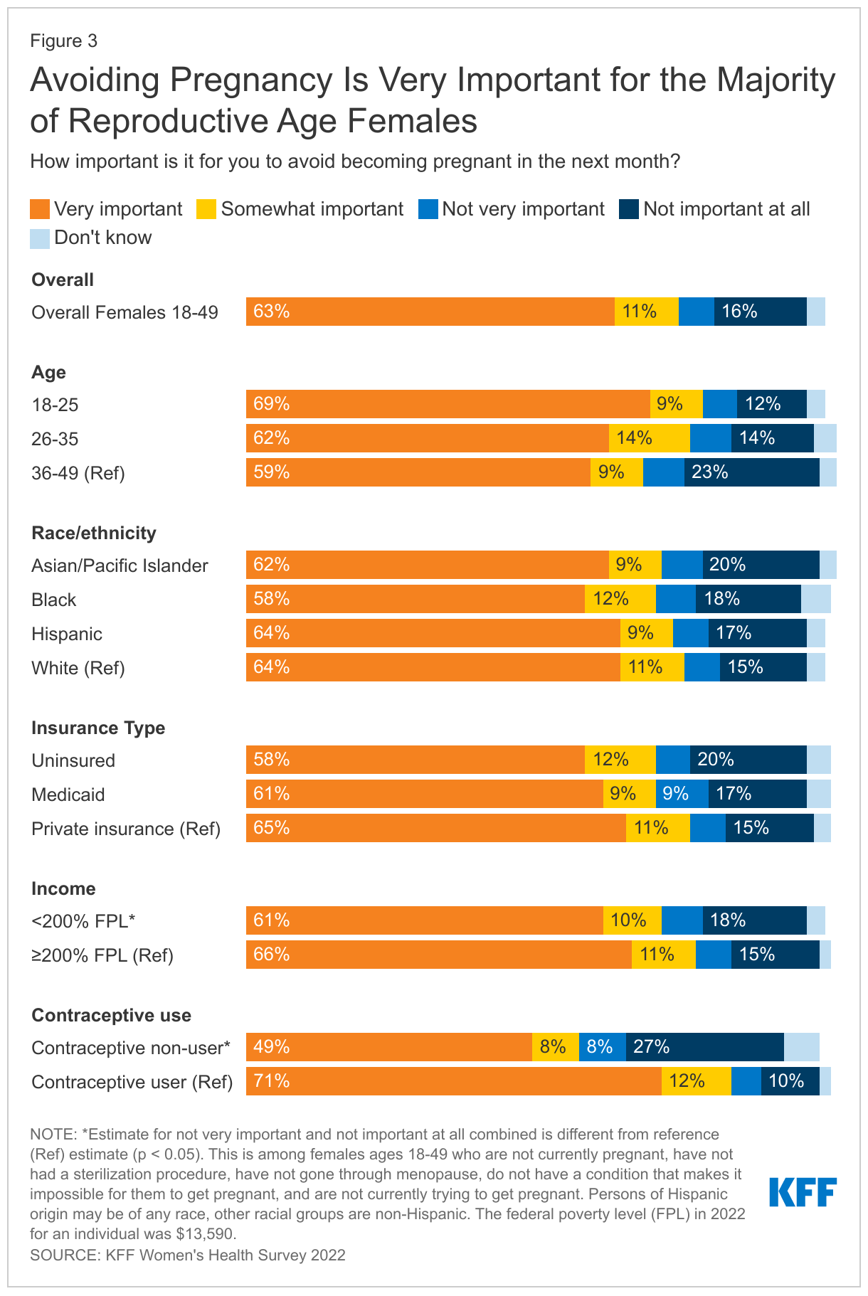 Most reproductive age females who are not actively trying to get pregnant say it is important to them to prevent pregnancy. However, one in five say avoiding pregnancy is not a priority.It is often assumed that pregnancy prevention is a priority for women who are not actively trying to get pregnant, but that is not always the case. Among females ages 18-49 who are not currently trying to get pregnant, the majority say it is very important (63%) or somewhat important (11%) for them to avoid becoming pregnant in the next month, but one in five (22%) females say it is not very important or not important at all (Figure 3). (Note that this survey was conducted before Roe v. Wade was overturned and this share could have changed now that abortion is no longer available in many states.)