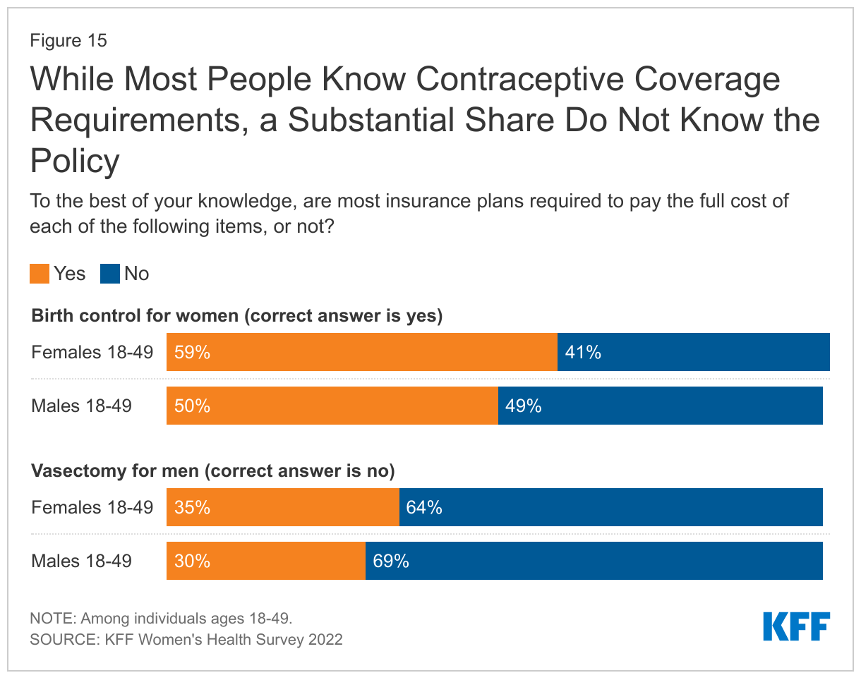 Many people do not know that insurance plans are required to cover contraceptives for females. Although the ACA’s requirement for most private insurance plans to cover the cost of contraceptives for women took effect over ten years ago, many people are still not aware of it of this requirement. Four in ten reproductive age females (41%) do not know that plans are required to contraceptives for women. Conversely, while there is no federal requirement for coverage of vasectomies, three in ten males incorrectly believe there is (Figure 15).