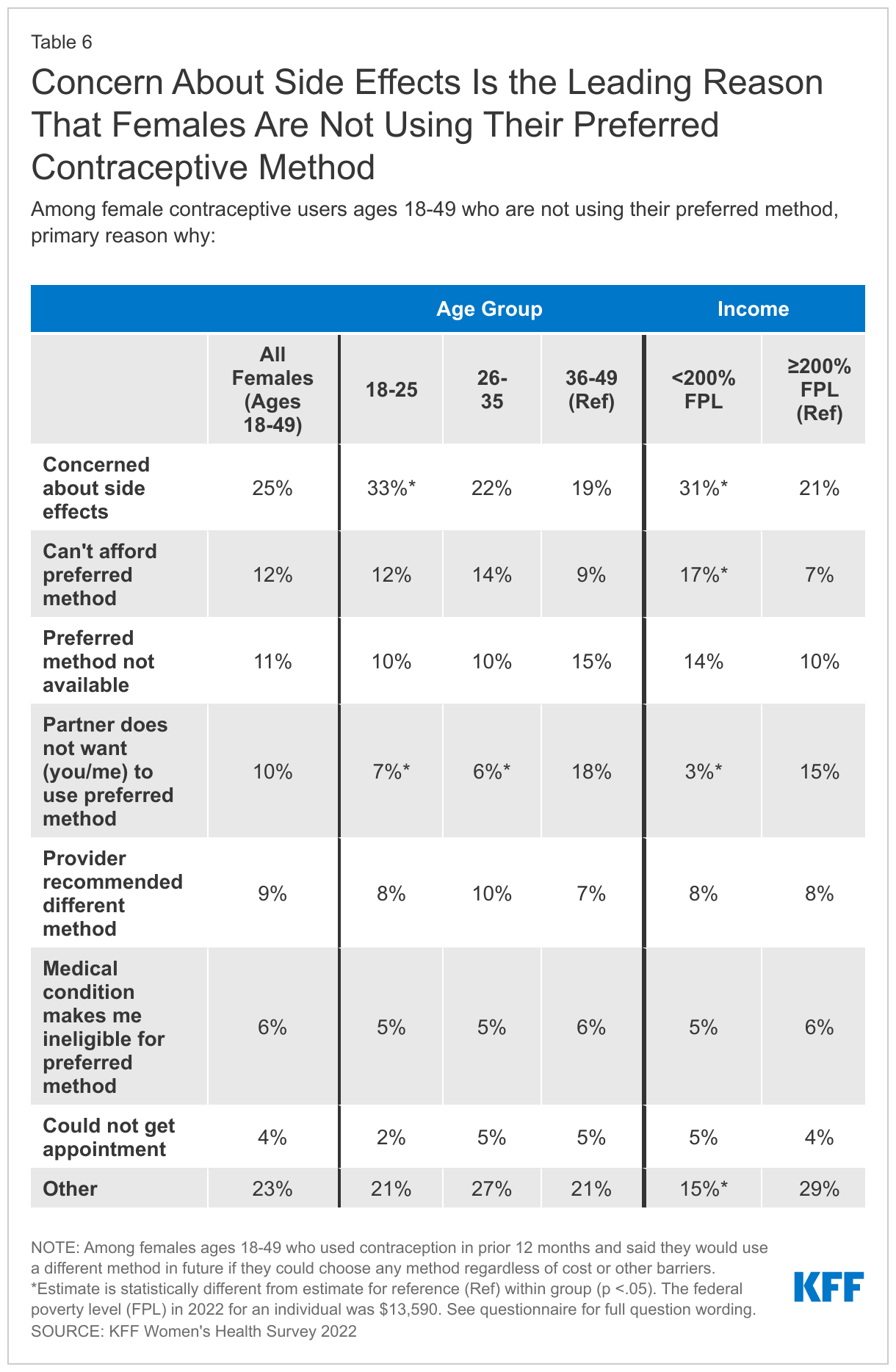 Among females who are not using their preferred contraceptive method, one in four say the primary reason is concern about side effects (25%). About one in ten say they can’t afford their preferred method (12%), their preferred method was not available (11%), their partner does not want them to use their preferred method (10%), or their provider recommended a different method (9%). However, there are some differences by age, race/ethnicity and income level (Table 6). One in three younger females ages 18-25 (33%) cites side effects as the primary reason they aren’t using their preferred method, compared to one in five females ages 36-49 (19%). About one in ten say they can’t afford their preferred method (12%), their preferred method was not available (11%), their partner does not want them to use their preferred method (10%), or their provider recommended a different method (9%). Notably, 17% percent of females with lower incomes say that they aren’t using their preferred method because they can’t afford it compared to 7% of females with higher incomes, and 15% of females with higher incomes say they aren’t using their preferred method because their partner objects to it compared to 3% of females with lower incomes.