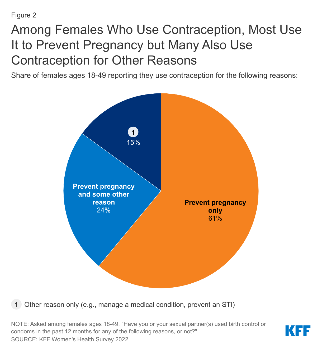 Among females who are using contraception, six in ten (61%) say they use contraception only to prevent pregnancy, but almost one-quarter (24%) say they use contraception both to prevent pregnancy and some other reason (Figure 2). One in seven (15%) use contraception solely for a reason not related to preventing pregnancy such as managing a medical condition or preventing a sexually transmitted infection (STI).