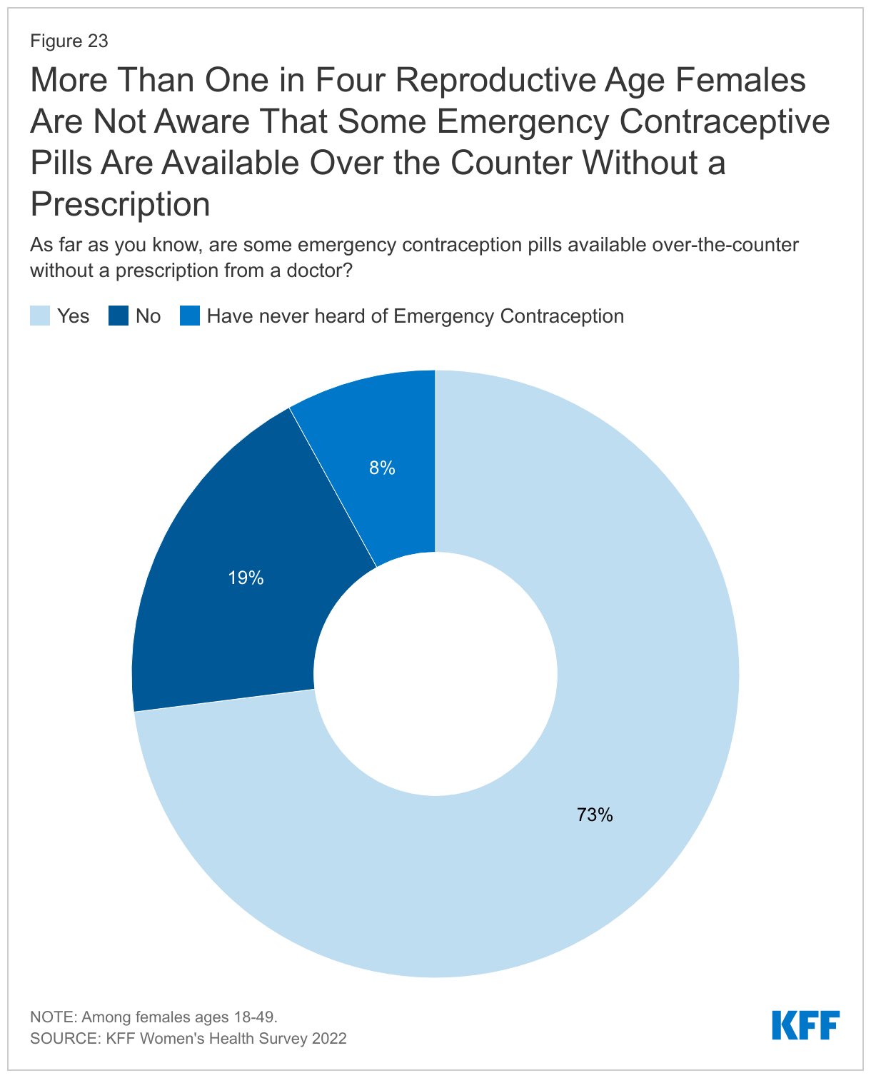 More than one in four reproductive age females are not aware that some EC pills are available over the counter without a prescription. Since EC must be taken soon after sex, over the counter availability can help people obtain it more quickly. Seven in ten (73%) reproductive age females know that some EC pills are available over the counter without a doctor’s prescription, but 19% do not know that and 8% have not heard of EC (Figure 23). This could affect their ability to obtain EC in a timely manner.