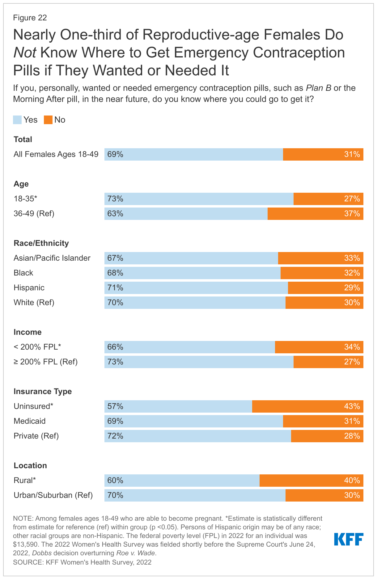 Not only was there a lack of awareness about where to get emergency contraceptive pills, but even before the Supreme Court overturned Roe v. Wade, few knew where they could get an abortion if they needed one. Prior to the ruling in Dobbs, just one-quarter (26%) of females ages 18-49 said they knew what clinic or health care provider they could go to for an abortion if they wanted or needed one. Smaller shares of females living in rural areas, where services are more limited, knew where they could go to get an abortion compared to females living in more urban areas (16% vs. 28%).