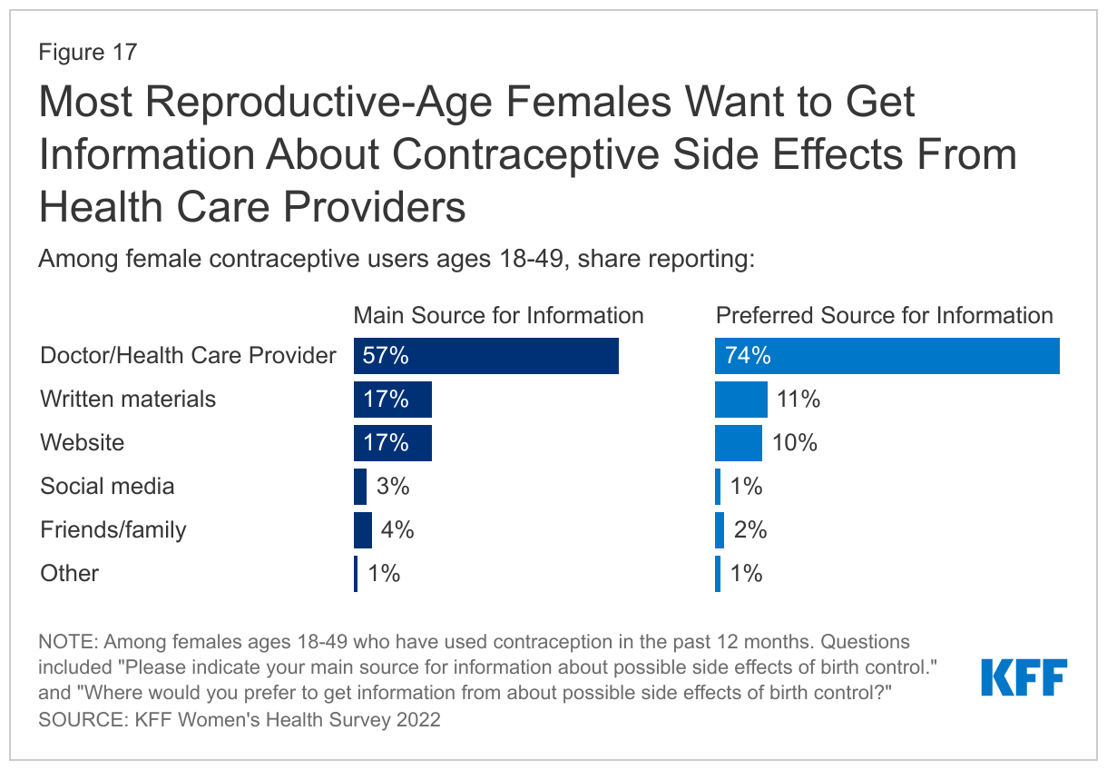 Health care providers are the main source of information about possible side effects from birth control for over half (57%) of reproductive-age females who use contraception (Figure 17). Fewer rely on written materials (17%) or a website (17%). When asked their preferred source for information about birth control side effects, three in four (74%) say doctors and health care providers. Although many (52%) say they would have wanted additional information about side effects, most females who have had a recent provider visit and use contraception (62%) say that their provider had talked to them about possible side effects before they started their current method. Providers often have limited time to counsel patients, which can leave patients without the information they want to make an informed decision about contraception.