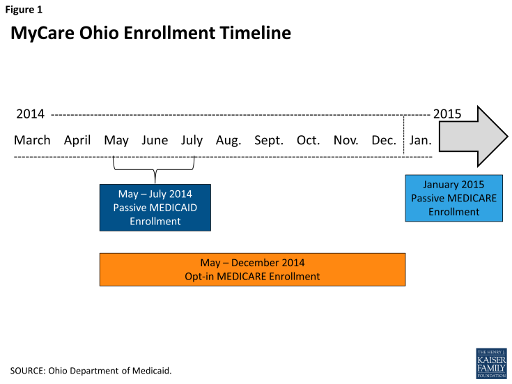 Unlike demonstrations in other states, Ohio concurrently implemented mandatory Medicaid managed care and the financial alignment demonstration. First, beneficiaries were automatically assigned to plans and enrolled in mandatory Medicaid managed care. During this time, enrollment in the financial alignment demonstration (including Medicare services) was voluntary for dual eligible beneficiaries. Next, Ohio automatically assigned remaining dual eligible beneficiaries to health plans for purposes of their Medicare benefits, effectuating their enrollment in the financial alignment demonstration. This issue brief focuses on the first phase of MyCare Ohio implementation, mandatory Medicaid managed care enrollment with optional enrollment in the financial alignment demonstration for Medicare benefits. It does not report on the integration of both Medicare and Medicaid benefits for the vast majority of participants following Medicare passive enrollment in January 2015. The results of this case study can inform the implementation of financial alignment demonstrations in other states over the coming months, as results from CMS’s evaluation of the demonstrations are not expected to be available for some time.