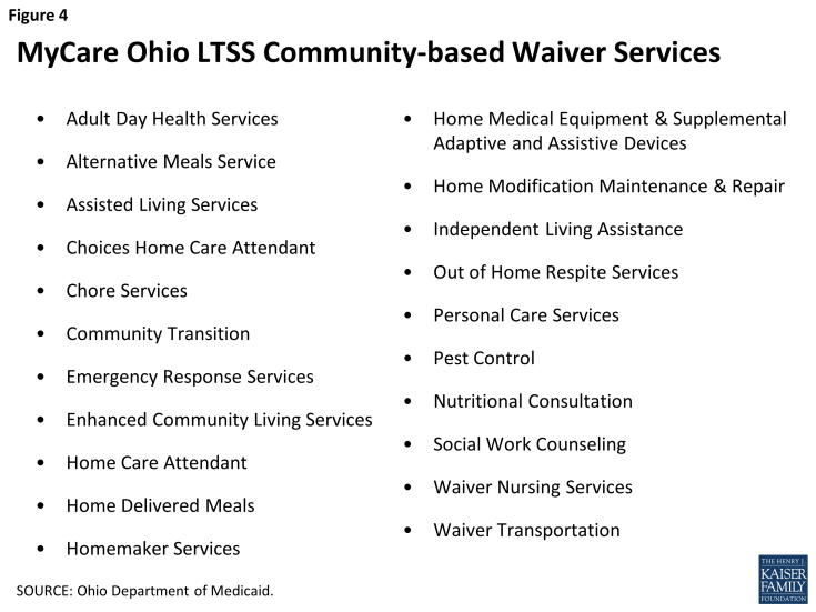The demonstration’s benefits package includes all benefits available through the Medicare and Medicaid programs, including LTSS and behavioral health services. Exceptions include Medicare hospice and Medicaid habilitation services, targeted case management, and institutional and home and community-based waiver services for individuals with I/DD. Plans have discretion to offer enhanced benefits, for example, expanded Medicaid state plan benefits such as transportation or dental services. Ohio needed Medicaid managed care authority to operationalize the model for MyCare Ohio because the state was not already delivering Medicaid benefits for dual eligible beneficiaries through capitated managed care. Prior to MyCare, a limited number of dual eligible beneficiaries were enrolled in managed care through the PACE program, while the vast majority (74%) of managed care enrollment in Ohio is made up of children and families. Adults with disabilities (non-duals) account for about 7 percent of the over 2 million individuals enrolled in managed care. Independent of its financial alignment demonstration authority, Ohio obtained a new § 1915(b)/(c) Medicaid managed LTSS waiver that encompassed all of Ohio’s five Medicaid § 1915(c) HCBS waivers where participation was dependent on the beneficiary having level of care (LOC) needs equivalent to that required for Medicaid nursing facility coverage.5 Beneficiaries enrolled in the new waiver saw their services expand to include homemaker and home care attendant services – services not previously offered under each HCBS waiver (Figure 4). The new Medicaid managed care waiver also allows beneficiaries to continue self-direction of services. Meanwhile, some waiver populations now have access to services such as nursing services and respite services that previously only were available to certain other waiver populations.