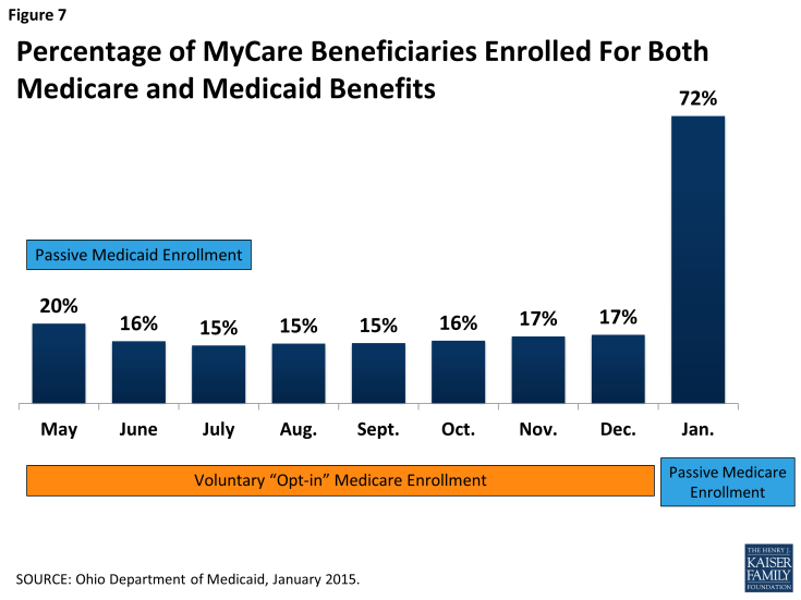 MyCare Ohio launched in May 2014, and as of January 2015, had enrolled 94,525 beneficiaries, over 82 percent of the 115,000 state residents initially estimated to be eligible for the financial alignment demonstration. Most beneficiaries (72 percent) were enrolled in the demonstration (including both Medicare and Medicaid services), with the remainder (28 percent) enrolled only in Medicaid managed care. First, beneficiaries were automatically assigned to plans and enrolled in mandatory Medicaid managed care. During this time, enrollment in the financial alignment demonstration (including Medicare services) was voluntary, and the enrollment rate for Medicare services averaged about 16 percent during the opt-in enrollment period. The demonstration enrollment rate for Medicare services increased to 72 percent once Medicare auto-assignment began.