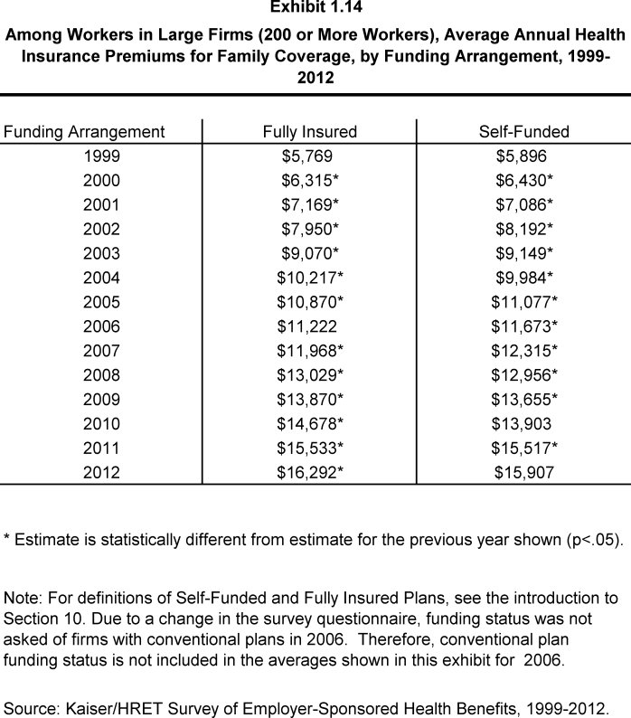 - For large firms (200 or more workers), the average family premium for covered workers in firms that are fully insured has grown at a similar rate to premiums for workers in fully or partially self-funded firms from 2007 to 2012 (36% in fully insured firms vs. 29% in self-funded firms) and from 2002 to 2012 (105% in fully insured firms vs. 94% in self-funded firms) 14.