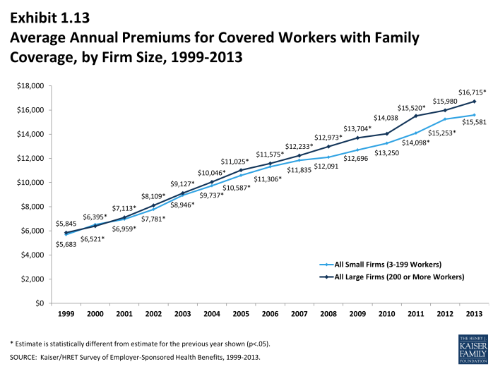 • Premiums for both small and large firms have seen a similar increase since 2008 (29%). For small firms (3 to 199 workers), the average family premium rose from $12,091 in 2008 to $15,581 in 2013. For large firms (200 or more workers), the average family premium rose from $12,973 in 2008 to $16,715 in 2013 13.