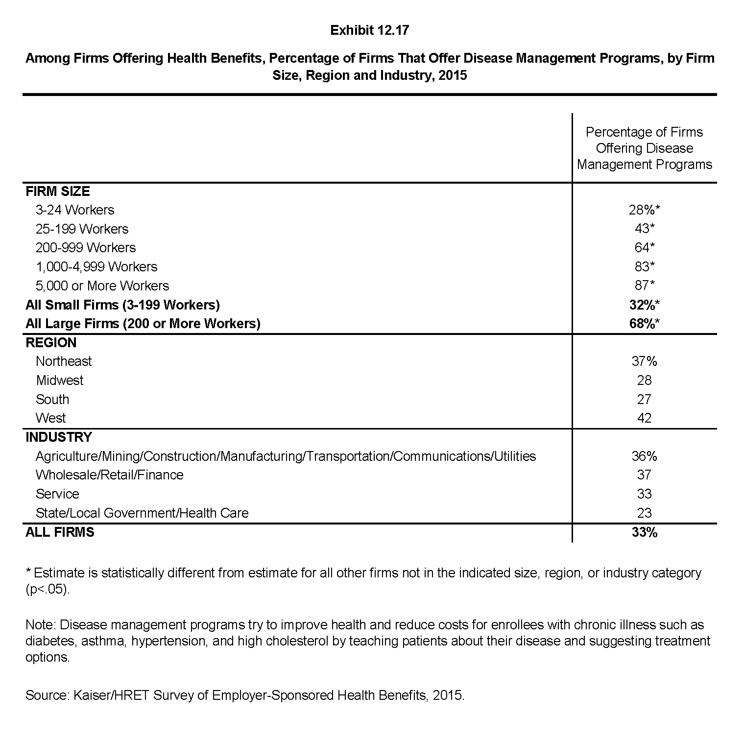 Disease management programs. Disease management programs try to improve the health and reduce the costs for enrollees with chronic conditions. Thirty-two percent of small employers and 68% of large employers offer disease management programs. Among firms with disease management programs, eight percent of large firms and 24% of firms with 5,000 or more workers offer a financial incentive to employees who participate.
