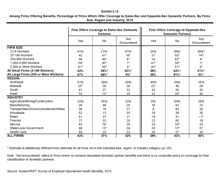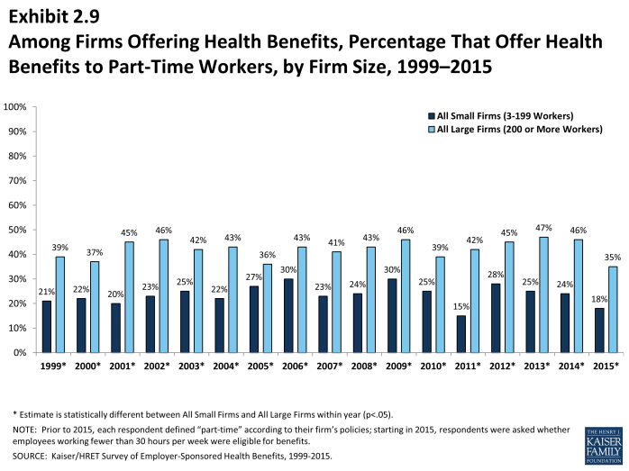 - Estimates presented in Exhibits 2.1, 2.2, 2.3 and 2.5 are based on the sample of both firms that completed the entire survey and those that answered just one question about whether they offer health benefits. ↩︎