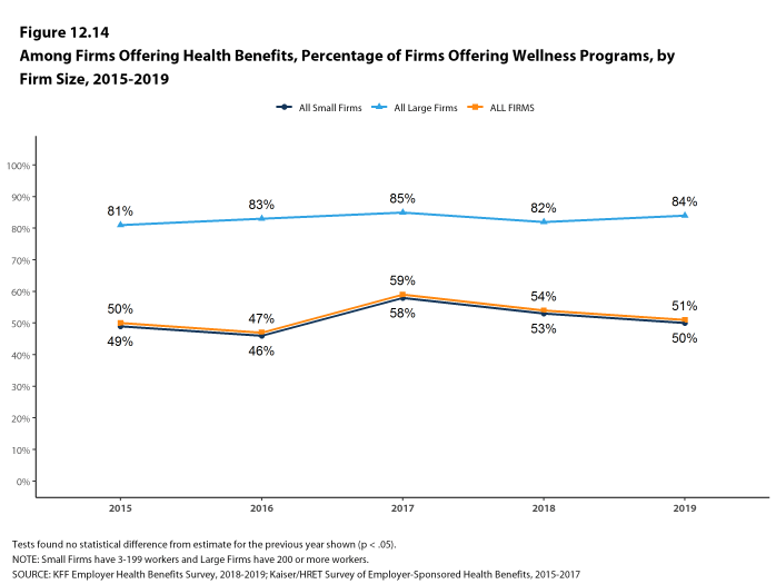 Figure 14.12: Among Firms With 50 or More Workers Offering Health Benefits, Percentage of Firms Whose Largest Plan Includes a High-Performance or Tiered Provider Network, by Firm Size, 2007-2019