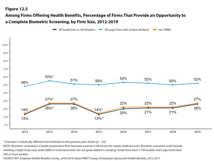 Biometric Screenings. Among firms offering health benefits, 26% of small firms and 52% of large firms provide workers the opportunity to complete a biometric screening. A biometric screening is an in-person health examination that measures a person’s risk factors, such as body mass index (BMI), cholesterol, blood pressure, stress, and nutrition. Fifty-eight percent of large firms with biometric screening programs offer workers an incentive to complete the screening, similar to the incentives for completing health risk assessments.