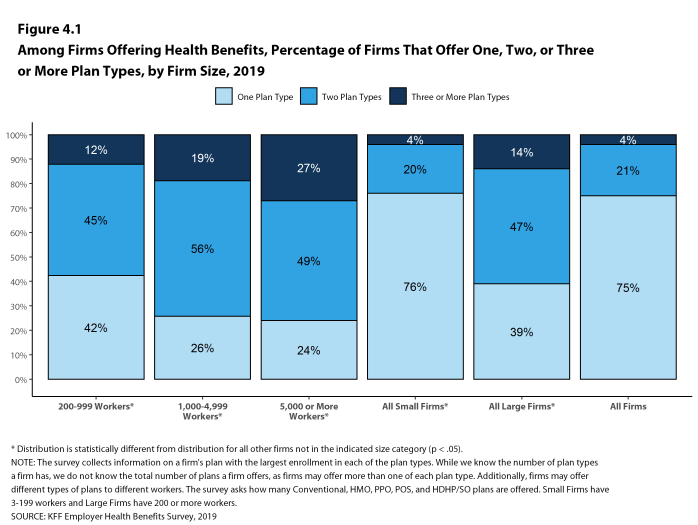 - Firms with 5,000 or more workers offering health benefits are more likely than firms of other sizes to offer at least one plan with a narrow network [Figure 14.17].
