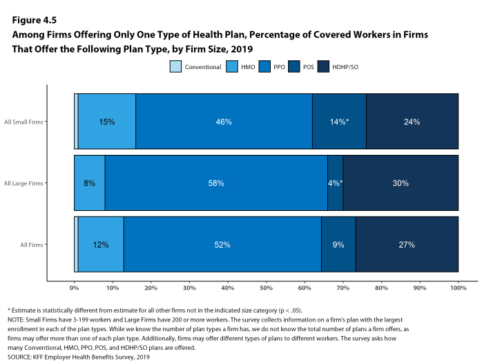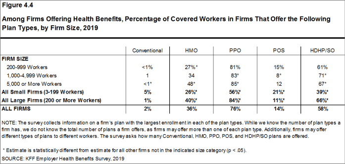 Figure 14.23: Among Firms Offering Health Benefits, Percentage of Firms Whose Plan Has Various Features, by Firm Size, 2019