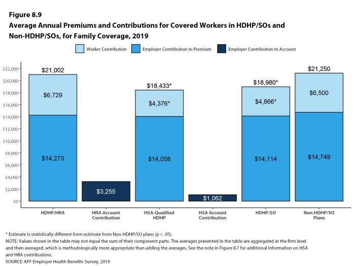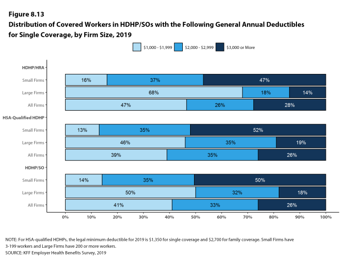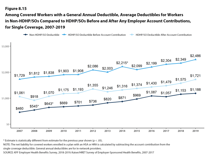 Deductibles have increased in recent years due to higher deductibles within plan types and higher enrollment in HDHP/SOs. While growing deductibles in PPOs and other plan types generally increase enrollee out-of-pocket liability, the shift to enrollment in HDHP/SOs does not necessarily do so because many HDHP/SO enrollees receive an account contribution from their employers. Twenty-one percent of covered workers in an HDHP with a Health Reimbursement Arrangement (HRA), and 2% of covered workers in a Health Savings Account (HSA)-qualified HDHP receive an account contribution for single coverage at least equal to their deductible, while another 22% of covered workers in an HDHP with an HRA and 23% of covered workers in an HSA-qualified HDHP receive account contributions that, if applied to their deductible, would reduce their actual liability to less than $1,000.