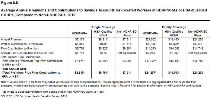 Figure B: Average Annual Worker and Employer Premium Contributions and Total Premiums for Single and Family Coverage, by Plan Type, 2019