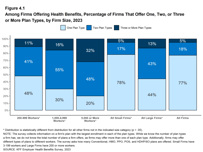 While nearly all large firms (firms with 200 or more workers) offer health benefits to at least some workers, small firms (3-199 workers) are significantly less likely to do so. In 2023, 53% of all firms offered some health benefits, similar to the percentage last year (51%).