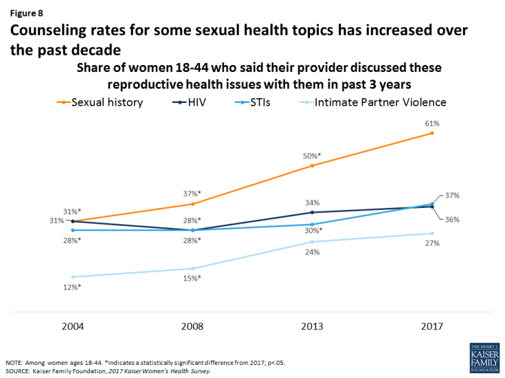 In 2004, less than a third of women reported recently speaking with a provider about their sexual history, but this has risen sharply to six in ten women (61%) in 2017 (Figure 8). Despite the ACA’s no-cost coverage for intimate partner violence (IPV) screening, provider counseling on violence however remains low at 27% but this is up from 12% in 2004. Counseling rates on HIV and STIs have risen modestly.
