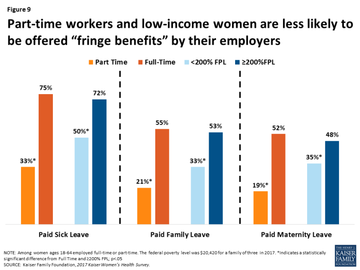 About two-thirds of working women report that their employer offered them paid sick leave (65%), while almost half are offered paid maternity leave (44%) and paid family leave (47%). However, low-income women and part-time employees are less likely to be offered these benefits (Figure 9).