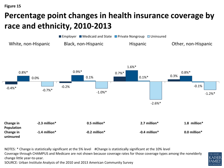 Figure 15: Percentage poing changes in health insurance coverage by race and ethnicity, 2010-2013