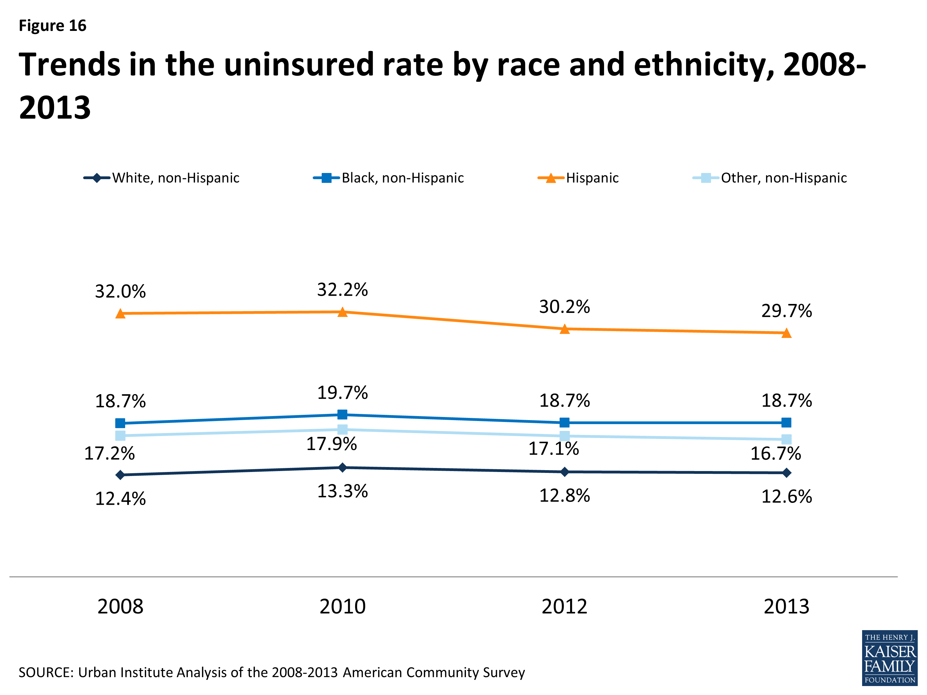 Between 2008 and 2013, the gap in the uninsured rate between non-Hispanic whites and Hispanics narrowed, from 19.6 percentage points in 2008 to 17.1 percentage points in 2013 (Figure 16). Most of this narrowing was due to increases in the Medicaid coverage rate for Hispanics, from 24.2 percent in 2008 to 29.8 percent in 2013, a gain of 4.4 million Hispanic Medicaid enrollees  (Figures 14 and 15). Despite these gains, the uninsured rate for Hispanics remained more than double that for non-Hispanic Whites in 2013. The gap in the uninsured rate between non-Hispanic Whites and non-Hispanic Blacks remained virtually unchanged, narrowing by only 0.2 percentage points.
