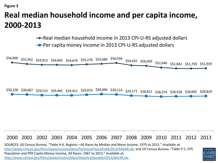 Real median household income and real per capita income also fell between 2008 and 2010 and have shown less recovery than other economic indicators. Median household income continued to fall between 2010 and 2012 and increased only $180 between 2012 and 2013, not a statistically significant change. Similarly, real per capita income remains more than $1,500 below its 2006 peak (Figure 3).