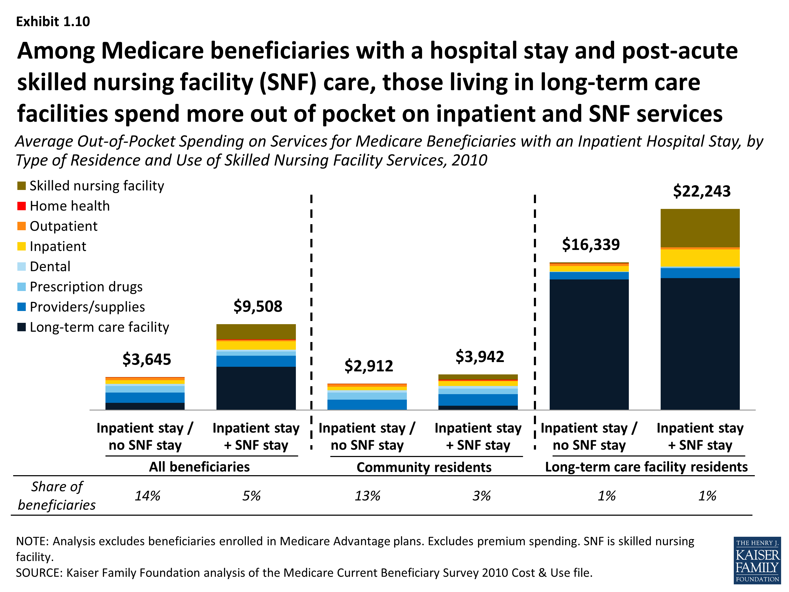 - Among beneficiaries who were hospitalized in 2010, those who received post-acute care in a SNF had significantly higher out-of-pocket spending on services than those who were discharged without SNF care ($9,508 vs. $3,645, respectively, on average); this was especially the case for long-term care facility residents with an inpatient stay and post-acute SNF care. Among beneficiaries with an inpatient stay followed by a skilled nursing facility stay, average out-of-pocket spending on SNF services was seven times greater among facility residents ($4,258) than among community residents ($595) in 2010.