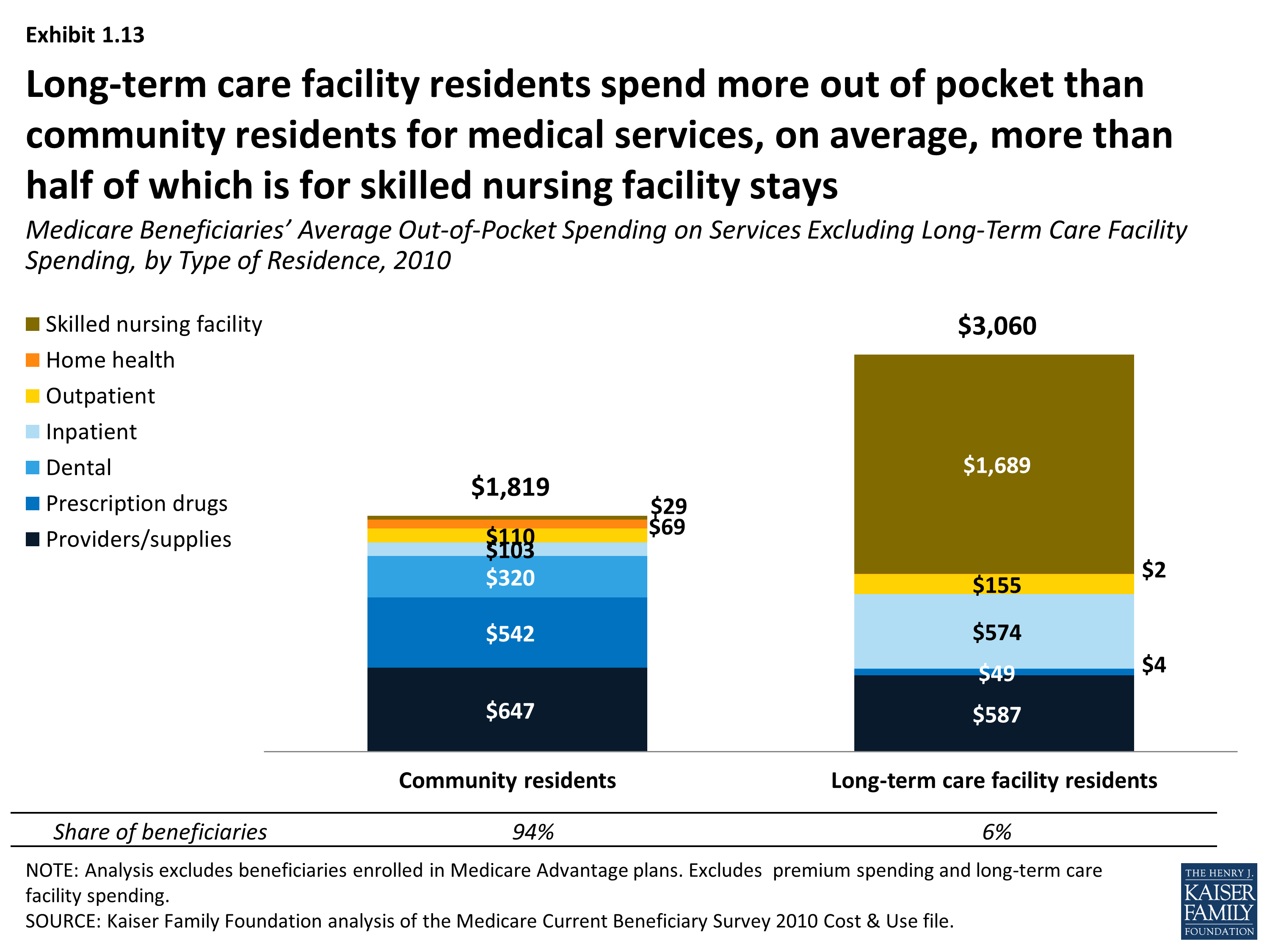 - The small share of beneficiaries who live in long-term care facilities face significantly higher out-of-pocket spending on medical and long-term care services than those in the community (averaging $17,534 and $1,858, respectively, in 2010). While most of their spending on services is for long-term care facility expenses, facility residents also incur higher costs for inpatient hospital and post-acute care services than beneficiaries living in the community.