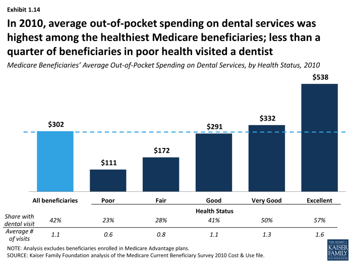 14. Average out-of-pocket spending on dental services was highest among beneficiaries in excellent health—a majority of whom (57%) visited a dentist in 2010—and five times higher than those in poor health ($538 vs. $111, respectively).