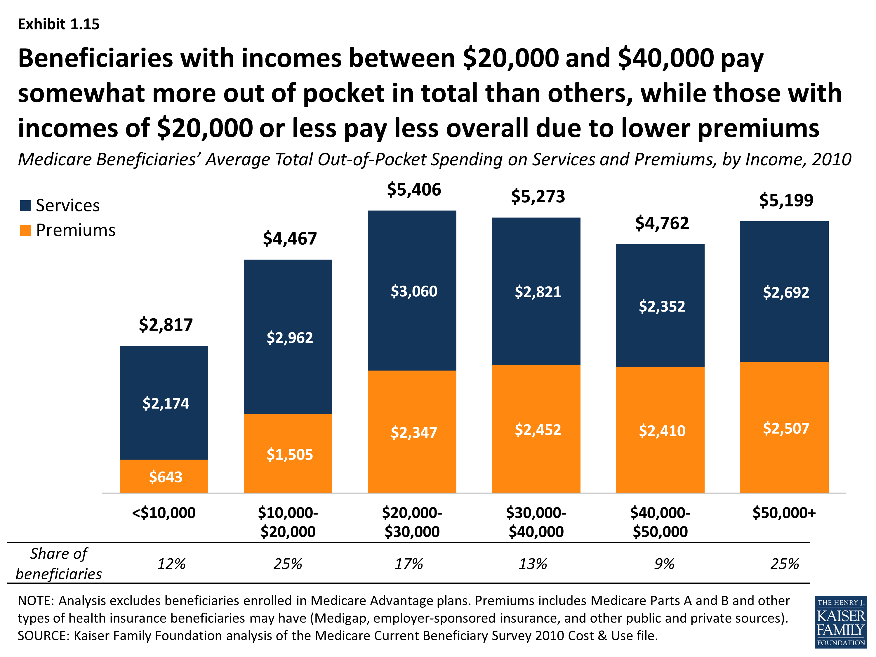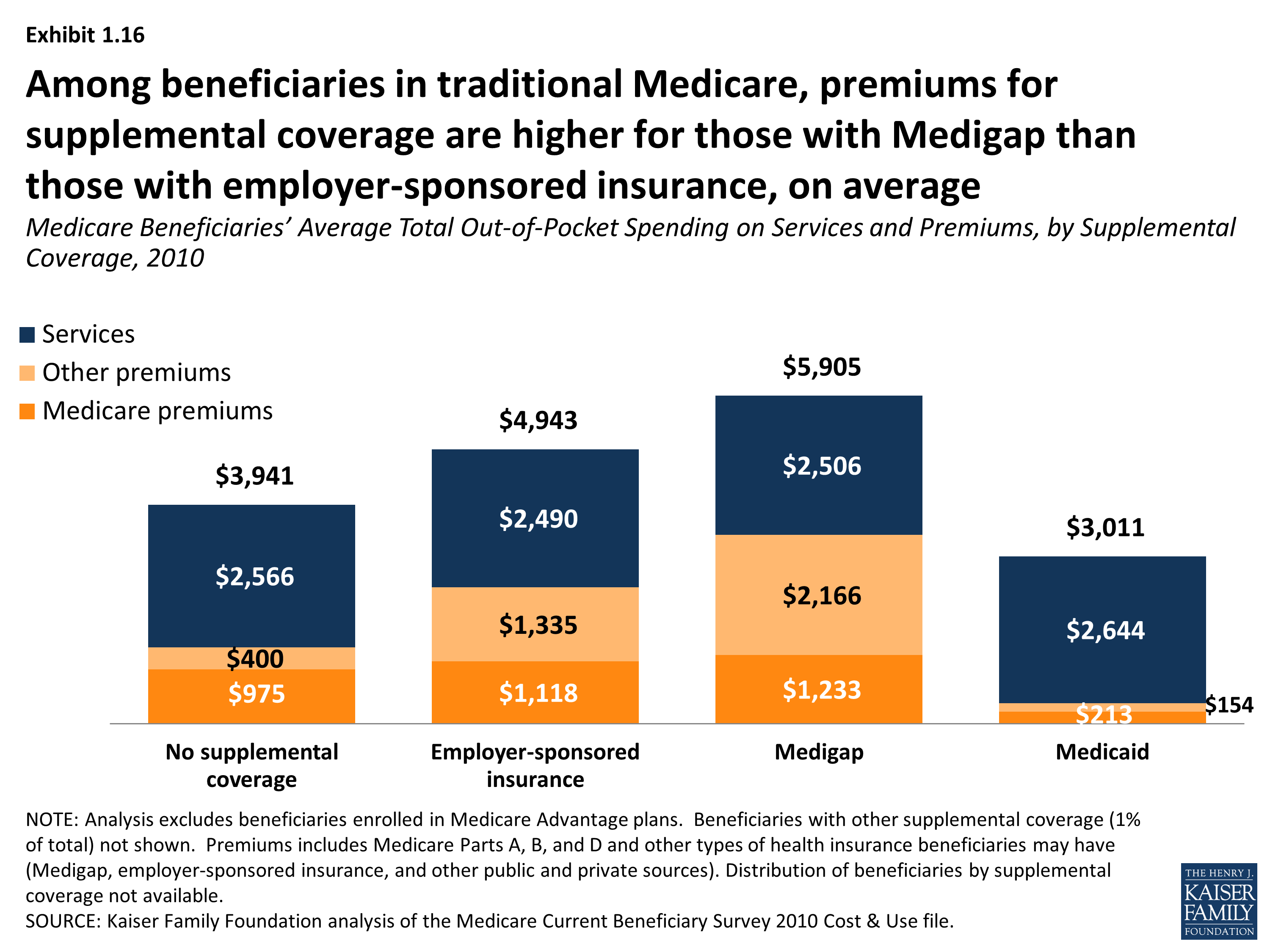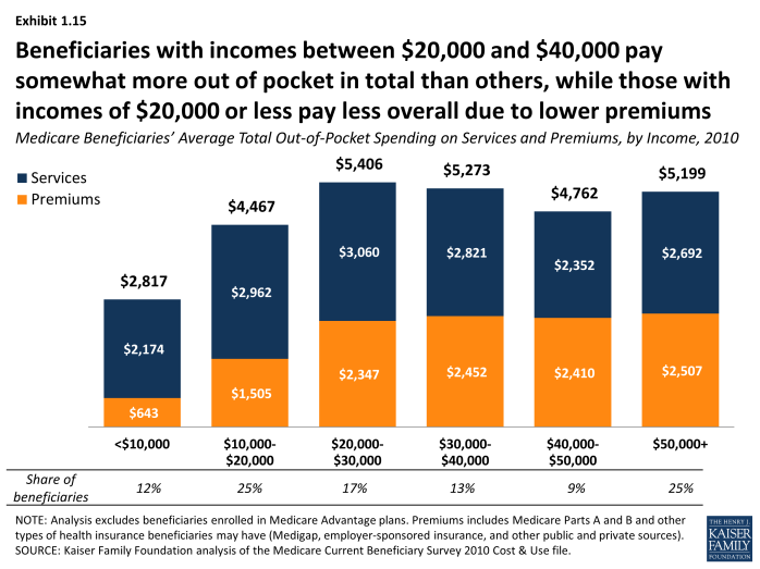 - Premiums for Medicare and supplemental insurance accounted for 42 percent of average total out-of-pocket spending among beneficiaries in traditional Medicare in 2010 (Exhibit ES.1).