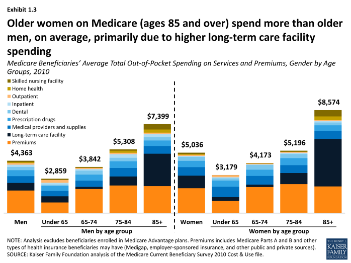 - On average, women on Medicare pay more out of pocket for services and premiums combined than men on Medicare ($5,036 vs. $4,363, respectively, in 2010), and this difference grows somewhat wider with age. Women ages 85 and over spent an average of $8,574 in 2010 on services and premiums while men ages 85 and over spent an average of $7,399 in total. This difference is primarily attributable to higher long-term care facility costs among older women.