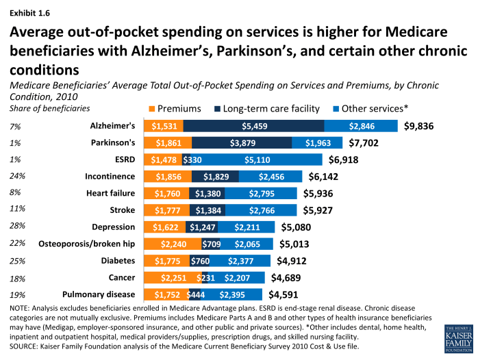 - Beneficiaries with Alzheimer’s disease, Parkinson’s disease, and end-stage renal disease (ESRD) have relatively high out-of-pocket spending on services compared to beneficiaries with certain other conditions ($8,305, $5,841 and $5,439, respectively, on average in 2010), but their higher costs are driven by use of different types of services. For example, for people with Alzheimer’s disease, long-term care facility costs accounted for a majority of their average out-of-pocket costs in 2010, while those with ESRD faced higher out-of-pocket costs for medical services.