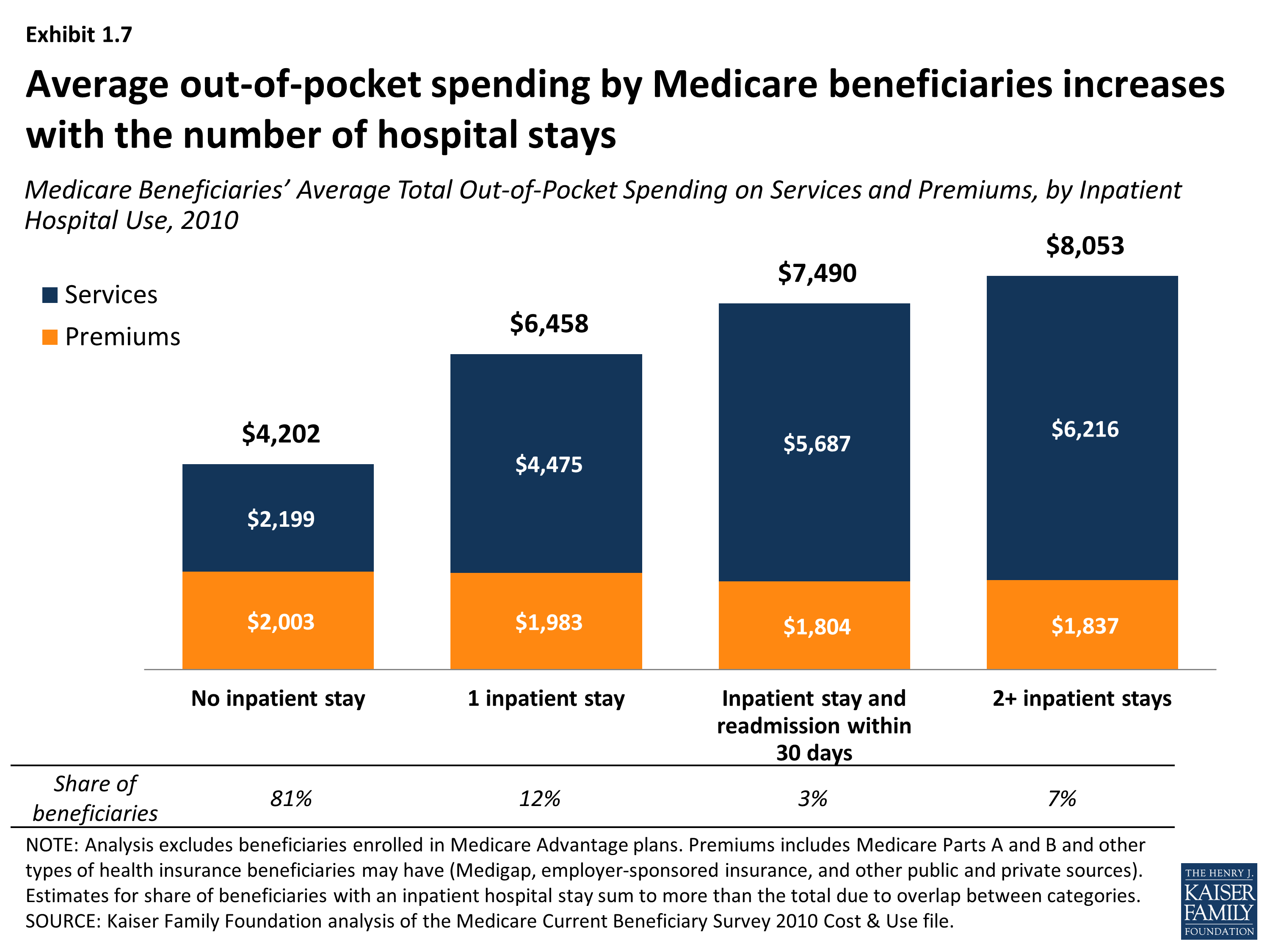 7. In 2010, roughly one in five Medicare beneficiaries experienced an inpatient hospital stay; those with one inpatient stay had average total out-of-pocket spending more than 50 percent higher than those without a hospital stay ($6,458 vs. $4,202) and their spending on services was twice as high, on average ($4,475 vs. $2,199). Those with two or more inpatient stays spent nearly twice as much in total as those without a hospital stay, on average ($8,053 vs. $4,202) and their average spending on services was nearly three times as much ($6,216 vs. $2,199). Patients with a hospital readmission within 30 days in 2010 spent on average roughly $1,200 more on services than those with only one inpatient stay ($5,687 vs. $4,475, respectively), including higher spending for medical providers/supplies, inpatient services, and skilled nursing facility services