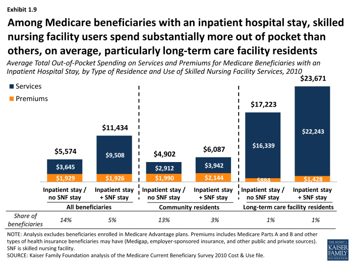Among Medicare beneficiaries with an inpatient hospital stay, skilled nursing facility users spend substantially more out of pocket than others, on average, particularly long-term care facility residents. Among beneficiaries who were hospitalized in 2010, those who received post-acute care in a SNF had significantly higher total out-of-pocket spending than those who were discharged without SNF care ($11,434 vs. $5,574, respectively, on average); their spending on medical and long-term care services was 2.5 times greater ($9,508 vs. $3,645); these average amounts were even larger for long-term care facility residents with an inpatient stay and post-acute SNF care