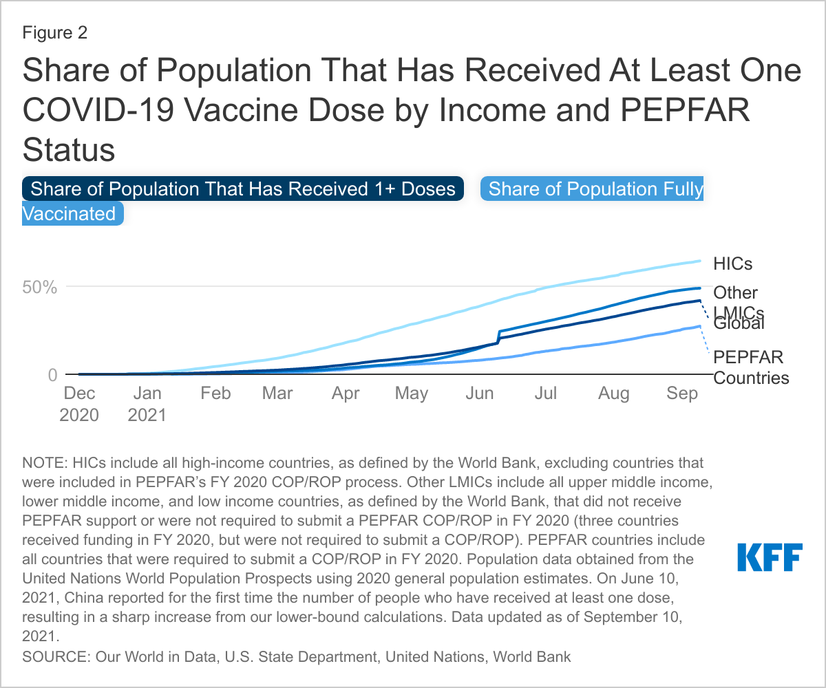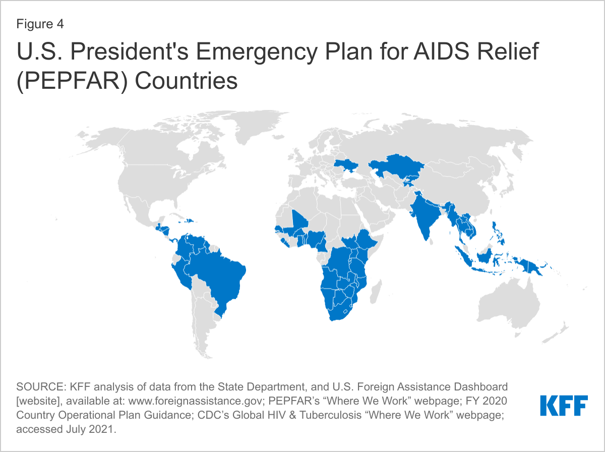 - KFF analysis of data from the U.S. Department of State’s U.S. Foreign Assistance Dashboard, accessed: www.foreignassistance.gov; U.S. Department of State, “Where We Work – PEPFAR” webpage, accessed: https://www.state.gov/where-we-work-pepfar (July 2021); U.S. Department of State, PEPFAR 2021 Country & Regional Operational Plan (COP/ROP) Guidance for All PEPFAR Countries, accessed: https://www.state.gov/wp-content/uploads/2021/02/PEPFAR-COP21-Guidance-Final.pdf; CDC’s Global HIV & Tuberculosis “Where We Work” webpage, accessed: https://www.cdc.gov/globalhivtb/index.html (July 2021). ↩︎