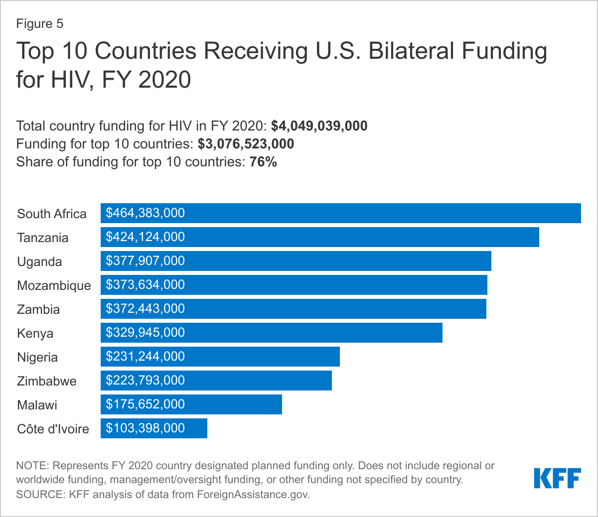 While PEPFAR’s bilateral funding has reached more than 100 countries since it launched, and today is provided to more than 50 countries (Figure 4),61 it has always concentrated its efforts in a smaller subset. This includes its original 15 “focus countries”,62 located primarily in sub-Saharan Africa, as well as its more recent emphasis on 13 “priority high-burden countries” for epidemic control, nine of which are original focus countries and all but one of which is in sub-Saharan Africa.63 ,64 Most of PEPFAR’s current country funding is concentrated in 10 countries,65 which together represent more than half (54%) of people living with HIV globally (Figure 5).66
