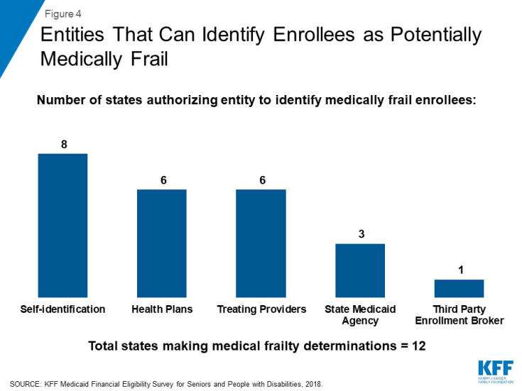 - Medical frailty determinations are assuming even greater importance for enrollees’ ability to retain the coverage and scope of benefits for which they are eligible, as some states implement Section 1115 waivers that impose restrictions on eligibility and benefits. Currently, six states must determine medical frailty to exempt these enrollees from restrictive waiver policies such as work requirements and premiums.