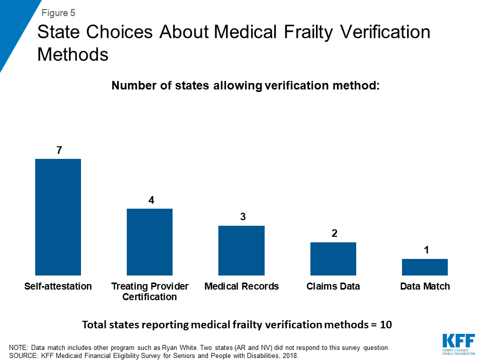 Over half of the states32 allow individuals to self-attest that they meet medical frailty criteria, instead of requiring documentation or other verification (Figure 5 and Appendix Table). Other sources of verification include treating provider certification, medical records, claims data, and data match with another program such as Ryan White. An existing body of research shows that additional reporting or administrative burdens can create barriers to eligible people retaining coverage. Half of the states provide for just one verification method, while the other six states allow more than one method.