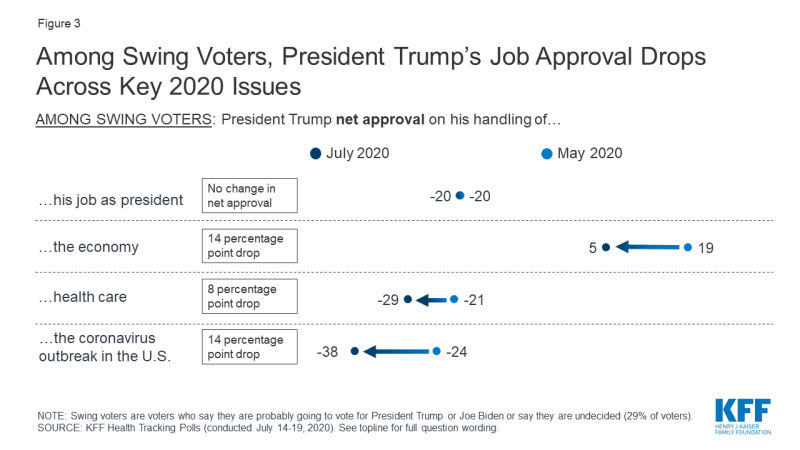 - The July poll also explores how two key groups of voters for the 2020 election (swing voters and Electoral College battleground voters) view the job President Trump is doing. About half of these voters approve of President Trump’s handling of the U.S. economy, but similar to overall voters, they disapprove of his handling of other issues.