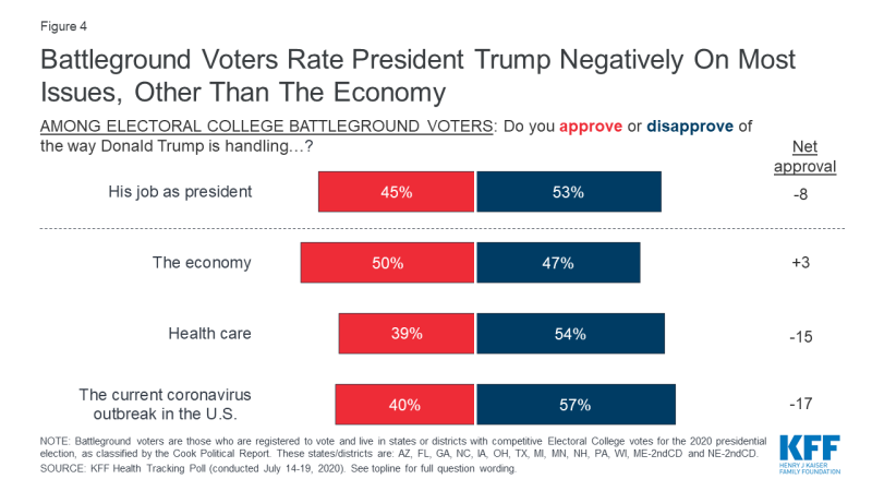 - Less than four months before the 2020 presidential election, the latest KFF Health Tracking Poll finds President Trump receiving his lowest ratings ever from voters on his handling of the coronavirus outbreak. President Trump still garners majority support from Republican voters on all key issues.
