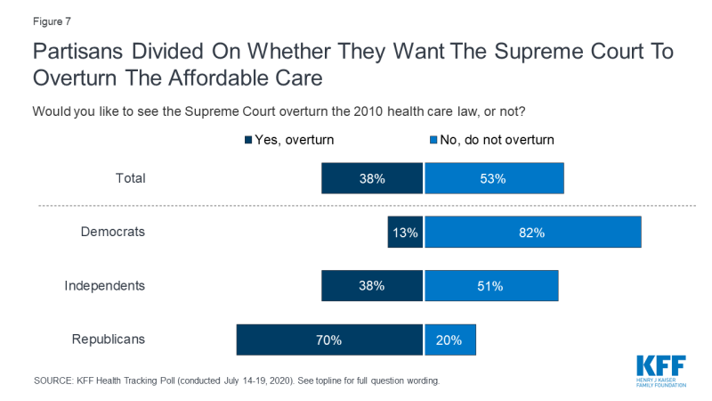 If the Supreme Court sides with the Trump administration and the coalition of Republican attorneys general, all or parts of the 2010 Affordable Care Act would no longer be the law of the land. About half (53%) of the public do not want to see the ACA overturned by the Supreme Court while four in ten (38%) say they want to see the law overturned. Once again, attitudes are largely partisan with eight in ten Democrats (82%) and half of independents (51%) not wanting the law overturned, while seven in ten Republicans say the Supreme Court should overturn the 2010 health care law. Previous KFF polling has found that majorities across partisans want many of the ACA’s protections to remain in place.