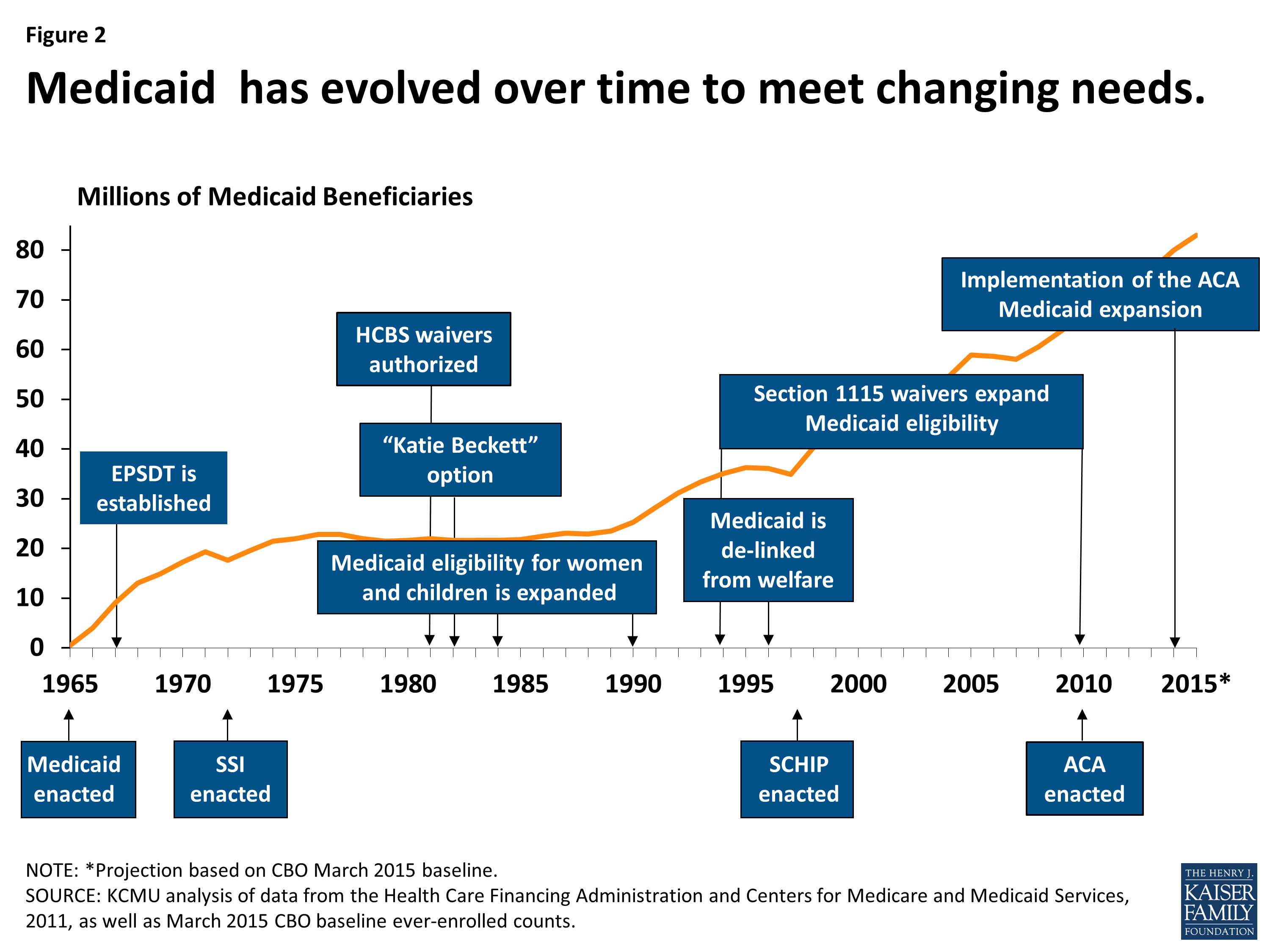 The Medicaid program, signed into law by President Lyndon B. Johnson on July 30, 1965, will reach its 50th anniversary this year, a historic milestone. At the Kaiser Commission on Medicaid and the Uninsured, where we have closely studied and analyzed Medicaid for nearly 25 years, we are recognizing this important occasion by documenting Medicaid’s evolution and its role in our health care system today. This report reflects on Medicaid’s accomplishments and challenges and considers the issues on the horizon that will influence the course of this major health coverage and financing program moving forward.