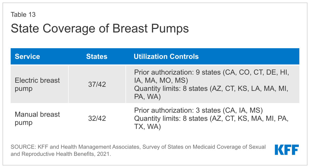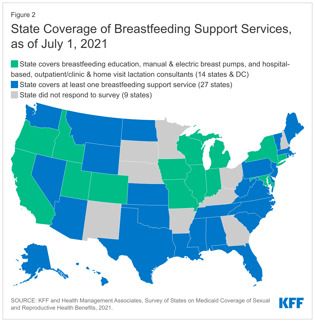 - The full array of breastfeeding services and supports– classes, pumps, lactation consultations–are covered by about one-third of the states under Medicaid. Several states indicated that breastfeeding education, such as an instructor led class, is covered as part of an office visit or global maternity fee, rather than through a separate reimbursement. Lactation consultation services are more commonly covered in the hospital setting, compared to outpatient and home visits after discharge. Most states cover manual and electric breast pumps, but some require prior authorization. In total, 15 of the survey states reported Medicaid coverage for all of the breastfeeding supports we asked about: educational classes, lactation consultations in the hospital, outpatient, and home settings, and electric and manual breast pumps.