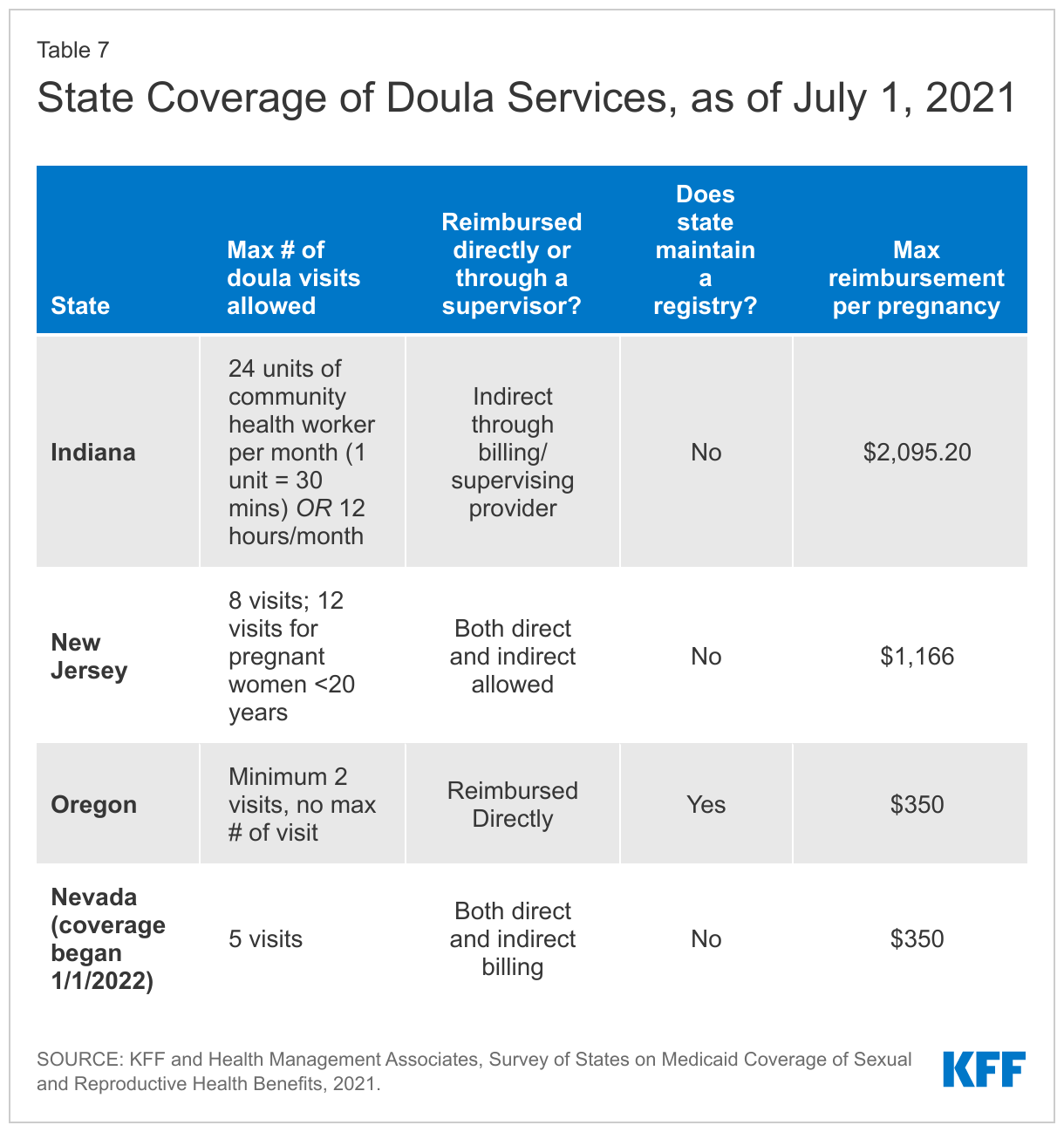 - While just three of the survey states reported covering doula services as of July 2021, several more states are considering adding doula coverage or are testing pilot programs. Indiana, New Jersey, and Oregon reported that they were covering doula services as of July 1, 2021. Minnesota, which did not respond to this survey, also covers doula services through their state Medicaid program. Several other states said that they have plans to begin coverage in 2022 or are considering adding doula benefits in the future.