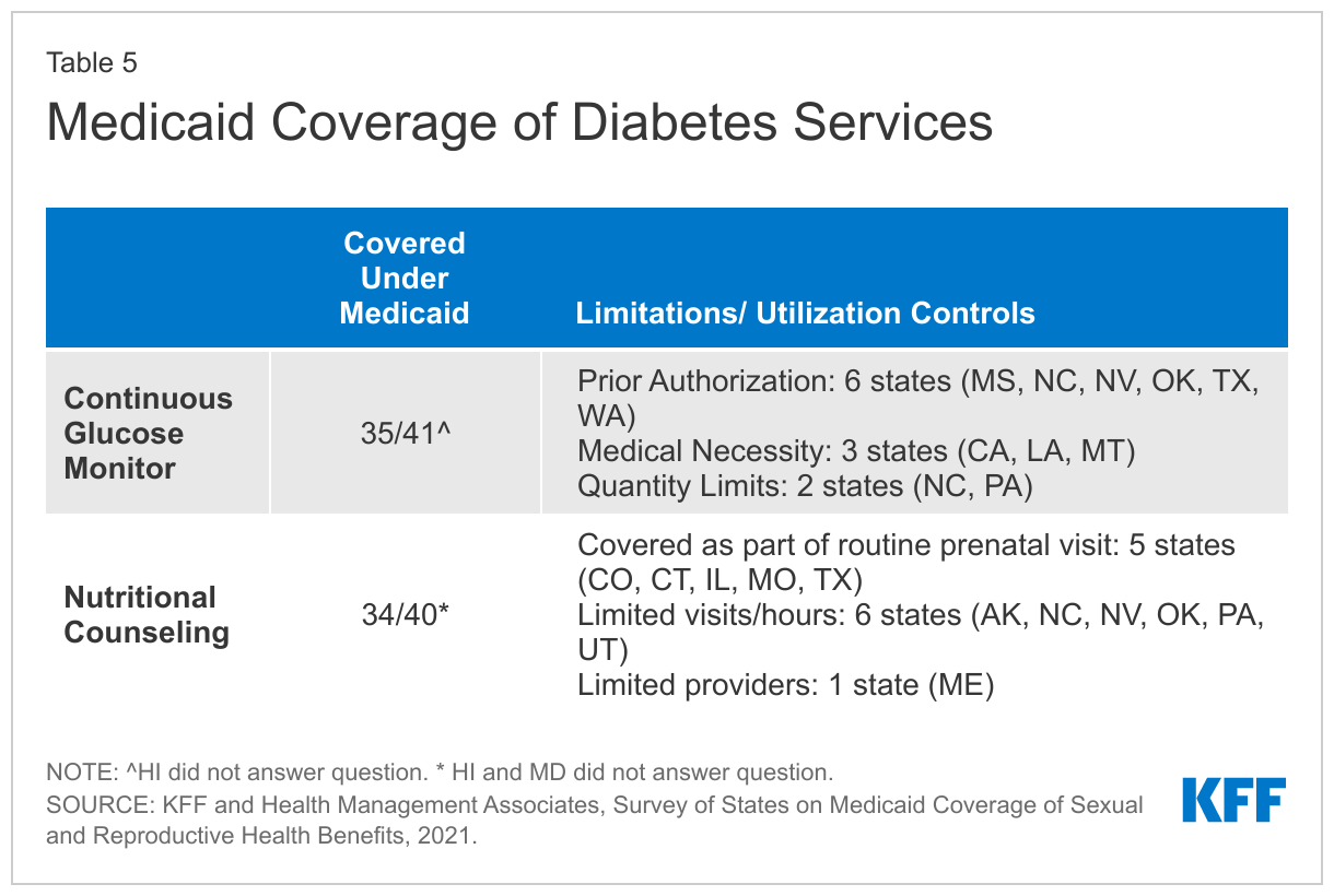 The majority of states cover continuous glucose monitors and nutritional counseling to support pregnant people with gestational diabetes. Gestational diabetes is a type of diabetes that appears during pregnancy for the first time. In the United States,10% to 20% of all pregnancies are affected by gestational diabetes, which can increase a pregnant person’s risk of having high blood pressure during pregnancy and developing Type 2 Diabetes after pregnancy. Both the USPSTF and HRSA recommend that pregnant people get screened for gestational diabetes at around 24 weeks gestation.