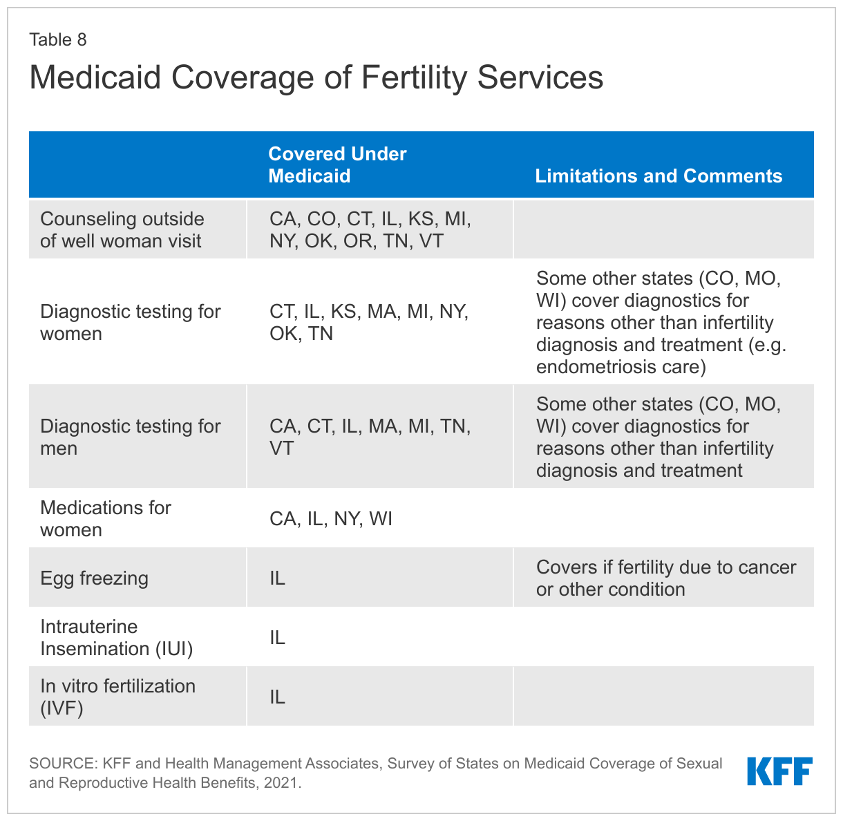 - The majority of states do not offer any coverage for fertility assistance services. Coverage for fertility care is a major gap in Medicaid. Just 11 states cover diagnostic testing related to fertility for women, and some of those states limit coverage to medical diagnoses. Furthermore, while states are required to cover most prescription medications under Medicaid, there is an exception that allows states to exclude coverage for fertility medications. Just four states (CA, IL, NY, WI) reported coverage of fertility medications.